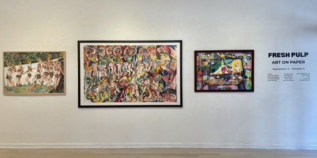 This Sunday, October 5th, marks the closing of the exhibition “Fresh Pulp: Art on Paper,” on view at the Van Der Plas Gallery since September 4th. The exhibition features works by artist Alejandro Caiazza, whose work is influenced by Neo-Expressionism, Outsider Art, Primitive Art, and Art Brut. His expressive and vivid figures explore the deepest and darkest aspects of the human condition, what has been described as “absurd brutality” and “distant coldness.” The exhibition also features artists Anne Marie Grgich and Christine Randolph, who, like Caiazza, use paper not only as a visual medium, but as a visual element and central participant in the creative process.