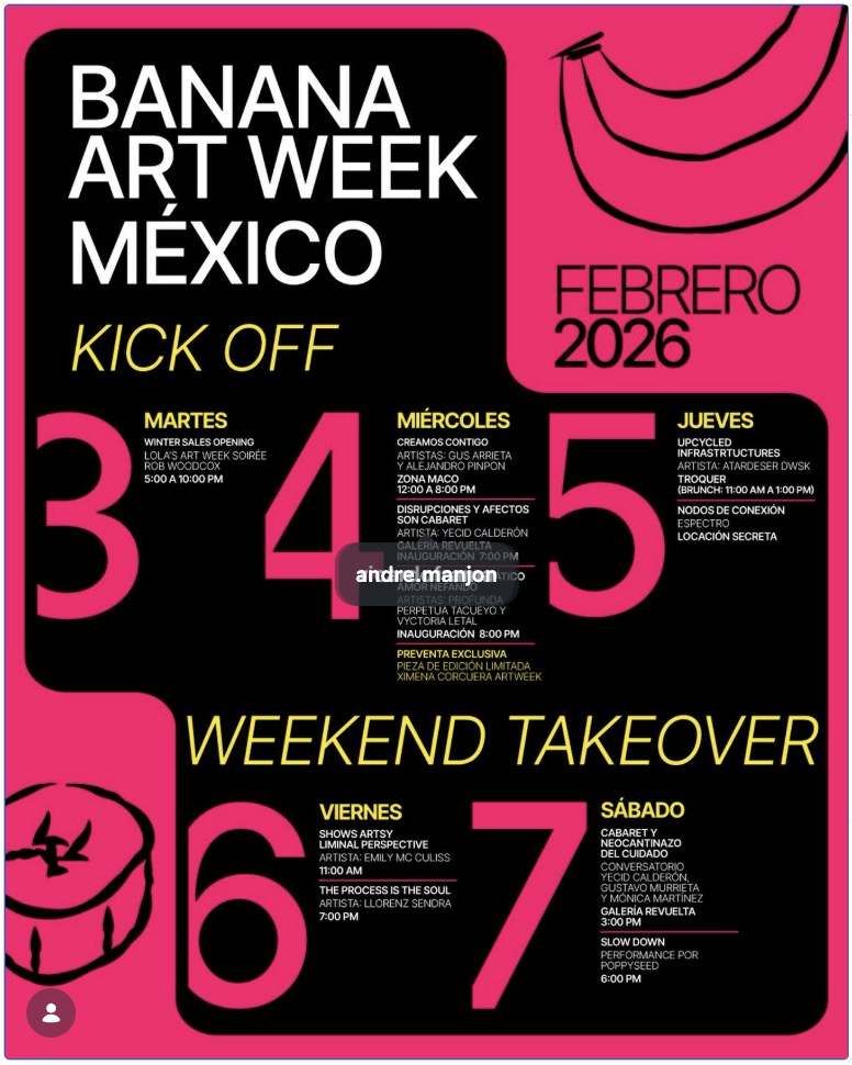 Banana Art Week se inserta en el momento más relevante del calendario artístico de Ciudad de México: la Art Week 2026 — del 4 al 8 de febrero — que incluye ferias internacionales como ZⓈONAMACO, la más grande de América Latina con cerca de 200 galerías de 27 países, así como múltiples exposiciones, espacios alternativos y encuentros entre artistas, curadores y coleccionistas.