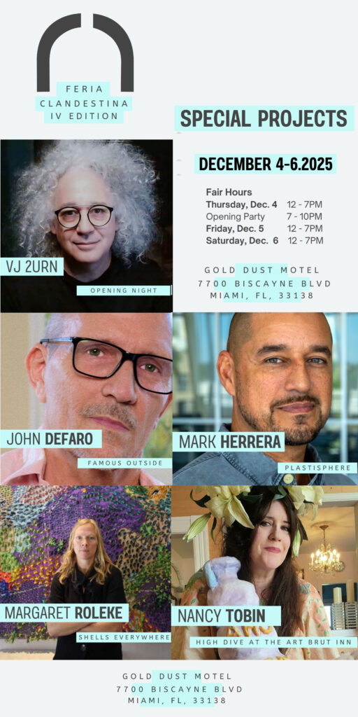 Feria Clandestina anuncia su cuarta edición, HERE NOW | AQUÍ AHORA, reforzando su colaboración con Activate Hospitality y el icónico Gold Dust Motel. La feria se consolida—y lidera—como la única feria de arte comunitaria e incubadora de Miami, un espacio donde convergen creatividad independiente, experimentación y nuevos modelos de intercambio cultural.