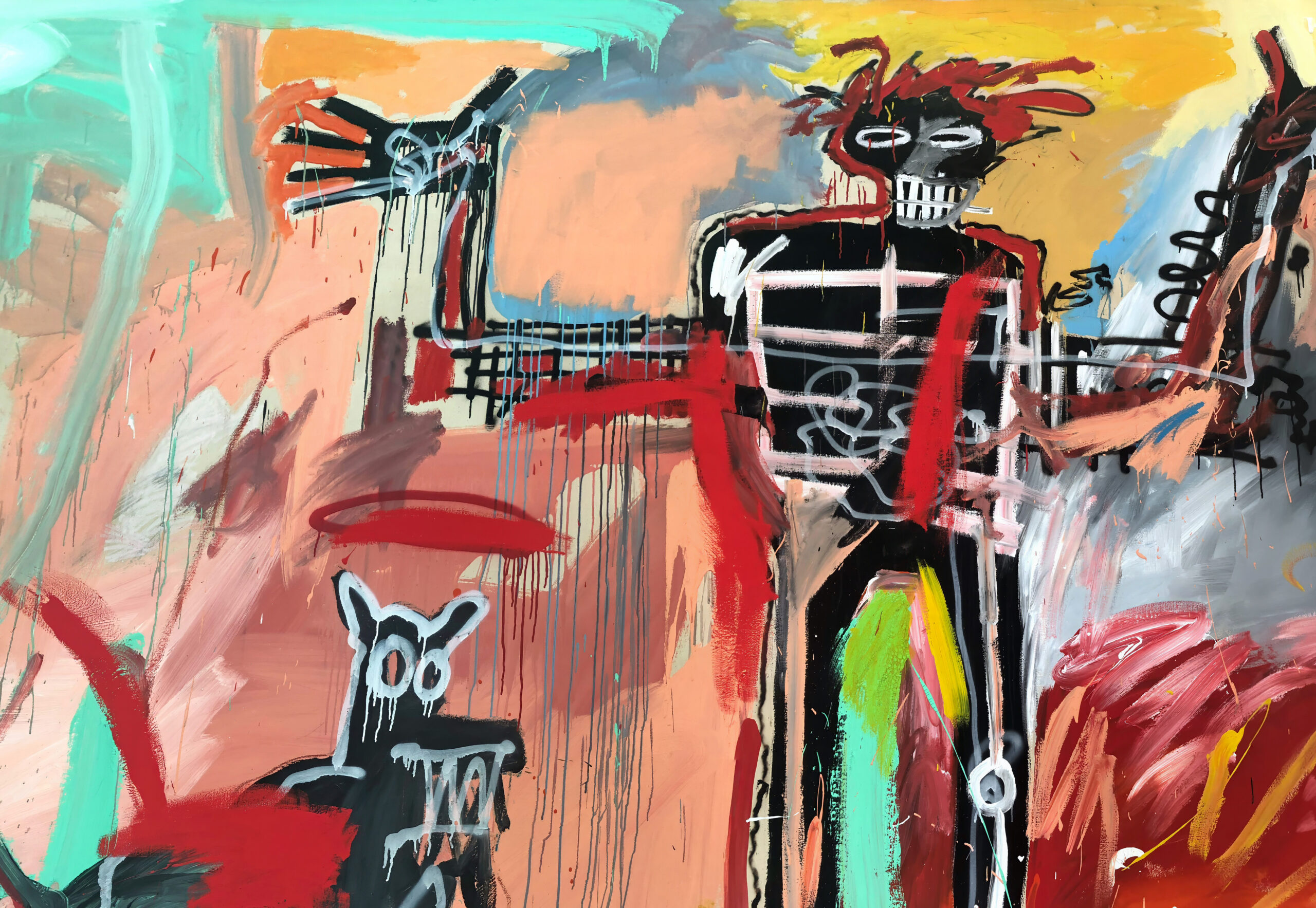 But Basquiat paints it with the formal vocabulary of his full Neo-Expressionist power: skeletal figures rendered with jagged, rapid brushstrokes, the boy’s three-pointed hair already gesturing toward the recurring crown motif that runs through his entire body of work. The figures are placed at the center of a polychromatic field — warm oranges and reds suggesting summer heat, the colors of a Pan-African tricolor investing the background with a political resonance that the surface innocence of the scene might otherwise obscure. The skeletal rendering of the Black figure does not suggest death or danger. It does something more complex: it simultaneously evokes the anatomical drawings of Gray’s Anatomy that captivated Basquiat since childhood and asserts a kind of structural clarity, a refusal of sentimentality, an insistence that the Black body be seen for what it is — sovereign, present, fully itself — without the mediating softness of idealization.