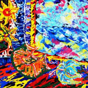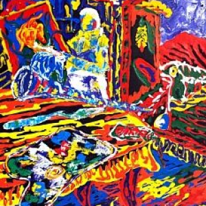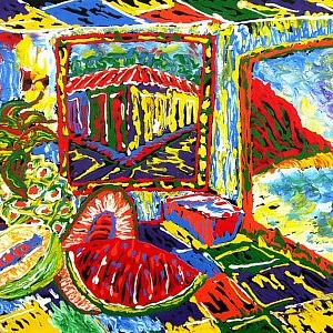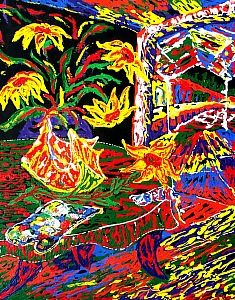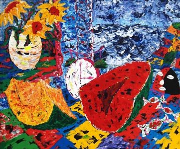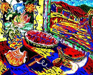 En sus cuadros encontramos arcaicas deidades, calderos y guardianes; jarrones con cayenas de inimaginables colores; frutas a veces sobredimensionadas junto a desnudos femeninos presentes como expresión de la lujuriosidad tropical; cuchillos deslastrados de todo signo de violencia, coladores de café derramando su presionado liquido para recordarnos un criollo despertar; pisos plenos de color entre torbellinos y cuadrículas que potencian la vibración de las formas y de los puntos de fuga; perinolas, trompetas, patines, huellas de la inocencia infantil del contacto con lo paradisíaco; y, caramelos, carritos, chupetas como ofrendas; tubos de acrílicos derramando su pintura dan pistas al espectador de los procesos creativos del artista que conviven junto a espátulas creadoras de texturas.