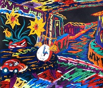 En la Espera, 2006 crea un clima edénico por la presencia de juguetes como patinetas, carritos, muñecos pero encontramos también en está pintura elementos que parecieran evadir lo íntimo, como son la presencia de montañas o marinas que se transforman en espacios dentro de espacios para profundizar en sentido de laberintos de ensueños, se plantea así en el espacio pictórico la relatividad de nuestra percepción de la realidad. Esto se une a la tensión entre la forma y su disolución, debido a que el artista desea hacernos dudar sobre lo que nos rodea para adentrarnos en otra percepción de la realidad, de ahí que uno de los rasgos predominantes de esta propuesta plástica sea la tensión que se logra al evitar la pincelada como correlato de la realidad cuyo extremo en la historia de la pintura es el hiperrealismo, llegando al extremo de evitar este recurso, pues éste lo obligaría a transmitir esa sensación de solidez y no de evanescencia que nos lleve a percibir la realidad como devenir. Este lenguaje pictórico nos enfrenta así a la espontaneidad plena a través del uso del acrílico que es capaz de atrapar el gesto o la huella del creador a causa de la rapidez de su secado y el uso que hace el artista de él. Al trabajar sus lienzos horizontalmente acentúa la gestualidad y el expresionismo destacando el uso desenfadado del color. Así, estos Bodegones son pinturas que logran un equilibrado sentido de belleza, que desean comunicar a través del color la energía y vibración como expresión de alma de la realidad.