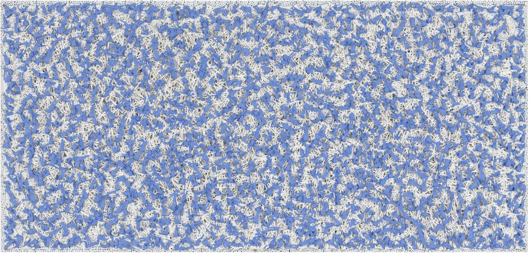 Across the four works presented in the exhibition, Galbut establishes a dynamic tension between material rigor and perceptual ambiguity. Intricate surfaces—resolute in their deployment—conceal earlier decisions that remain partially visible. This layering reflects what might be called decisive uncertainty: a condition mirrored in procedural contradictions such as order and cacophony, precision and excess, vast scale and detailed gesture.