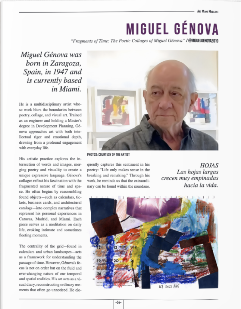 Miguel Génova was born in Zaragoza, Spain, in 1947 and is currently based in Miami. He is a multidisciplinary artist whose work blurs the boundaries between poetry, collage, and visual art. Trained as an engineer and holding a Master’s degree in Development Planning, Génova approaches art with both intellectual rigor and emotional depth, drawing from a profound engagement with everyday life.