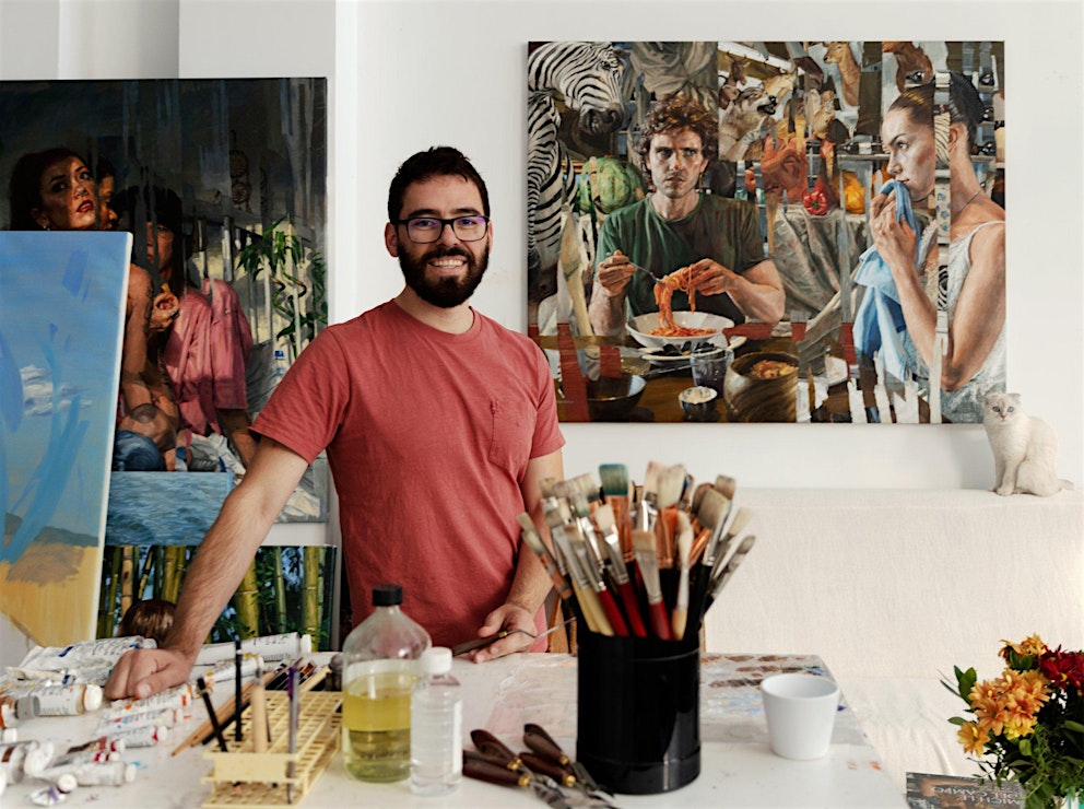 In his recent paintings, he’s transcending realism, crafting compositions that embody fragments of a reality formed by diverse moments and places. This connection mirrors the way we engage with images nowadays.