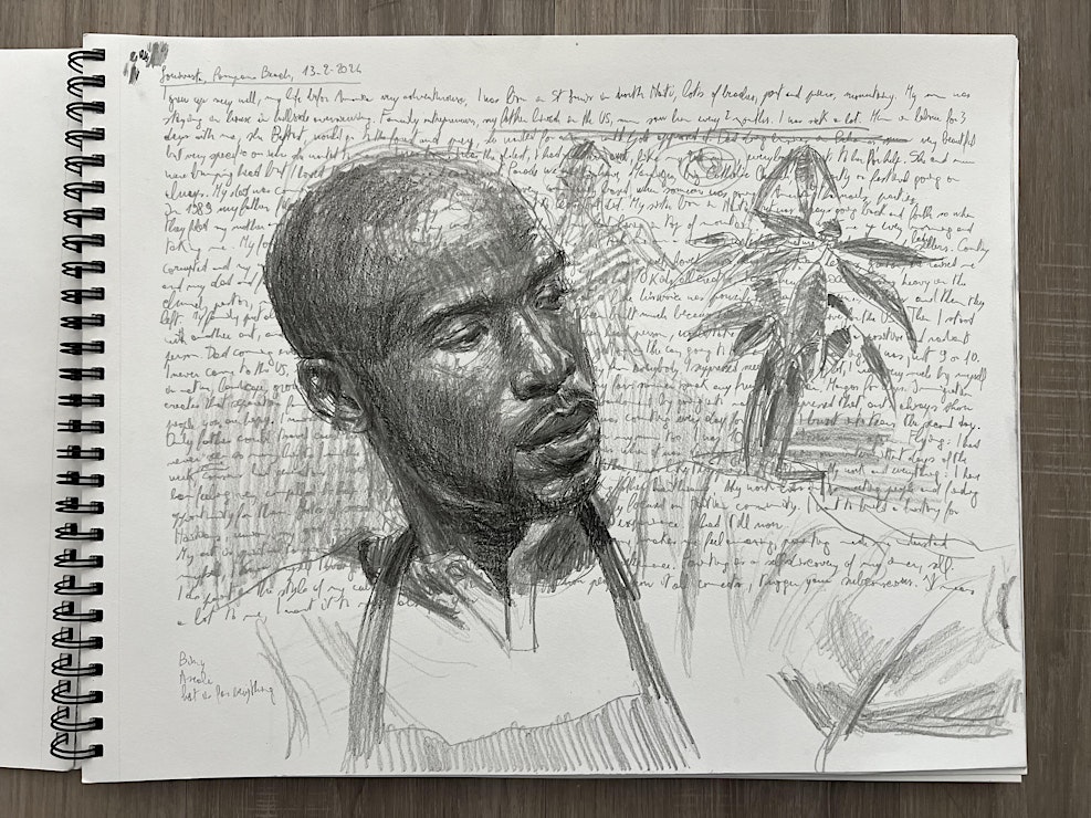 He paints people his friends and family, and the people he meets in his travels, and fondly cultivates his circle without borders. His paintings, far from simply seeking to capture a resemblance with his sitters or the reality as it is, strive to construct a narrative. He gets inspiration from the stories of his sitters, to speak about the uprooting, the zest for life, the solitude and the awareness of the ephemeral.