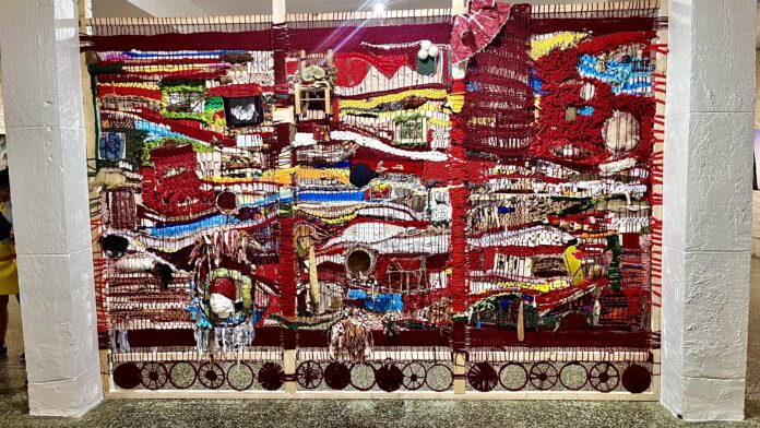 Uno de los aspectos más destacados de la exposición es la instalación colaborativa creada por el grupo de alrededor de diez artistas de la organizacion Fama (Fiber Art Miami Artists), entre las que pudimos saludar a las artistas Marine Fonteyne, Roberta Blatt, Valeria Montag, Vero Murphy, todas bajo la dirección de Aurora Molina. Esta pieza, construida dentro del propio museo, sirve como punto focal de la exposición. Molina, una célebre artista conocida por sus obras intrincadas y socialmente conmovedoras, orquestó esta colaboración para reflejar el dinamismo y la complejidad de la comunidad y la identidad. La instalación, una estructura textil extensa y multifacética, invita a los visitantes a navegar por sus rincones, y cada giro revela una nueva perspectiva o una historia oculta. Encapsula la esencia de “INSIDE THE WALLS” al transformar el espacio del museo en una obra de arte viva.