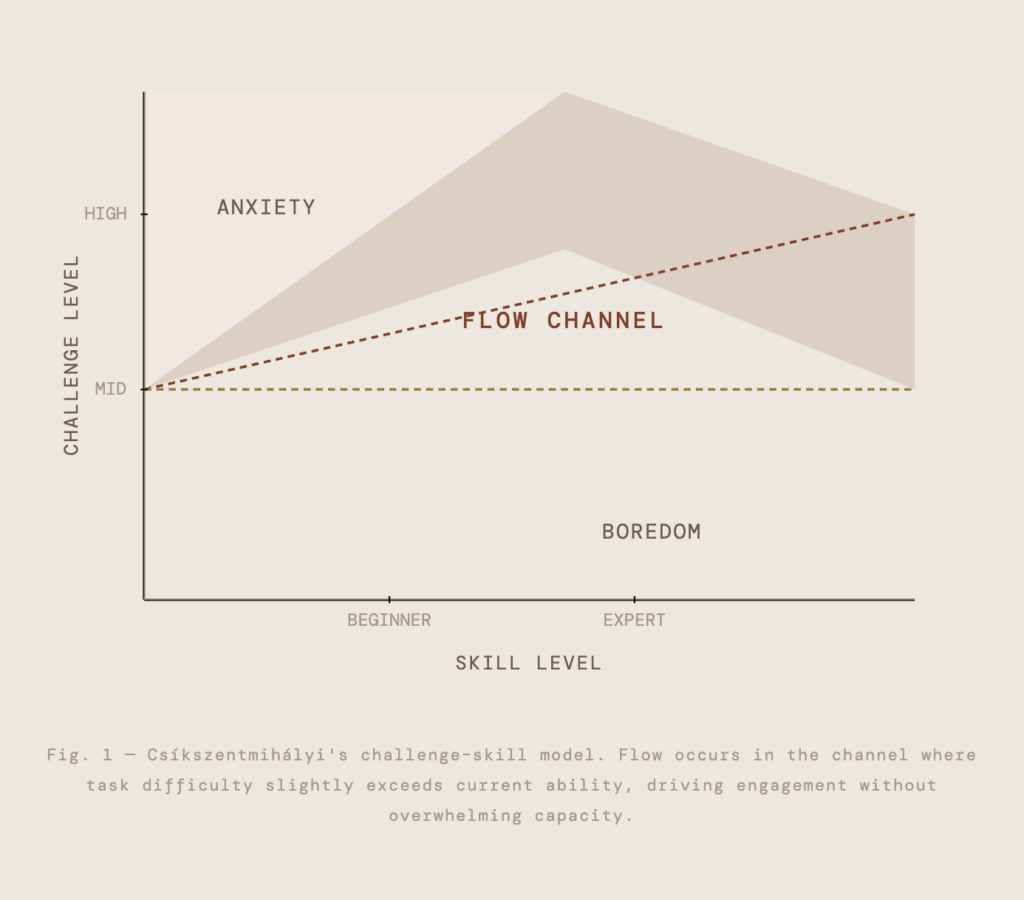 Flow lives in the narrow band between these extremes — what researchers describe as the “sweet spot” of optimal challenge. The practical discipline is learning to calibrate tasks to operate in this zone deliberately: to stretch, but not to break. As skill grows, so too must the challenge. Flow is not a destination but a dynamic equilibrium, always requiring recalibration as the practitioner develops.