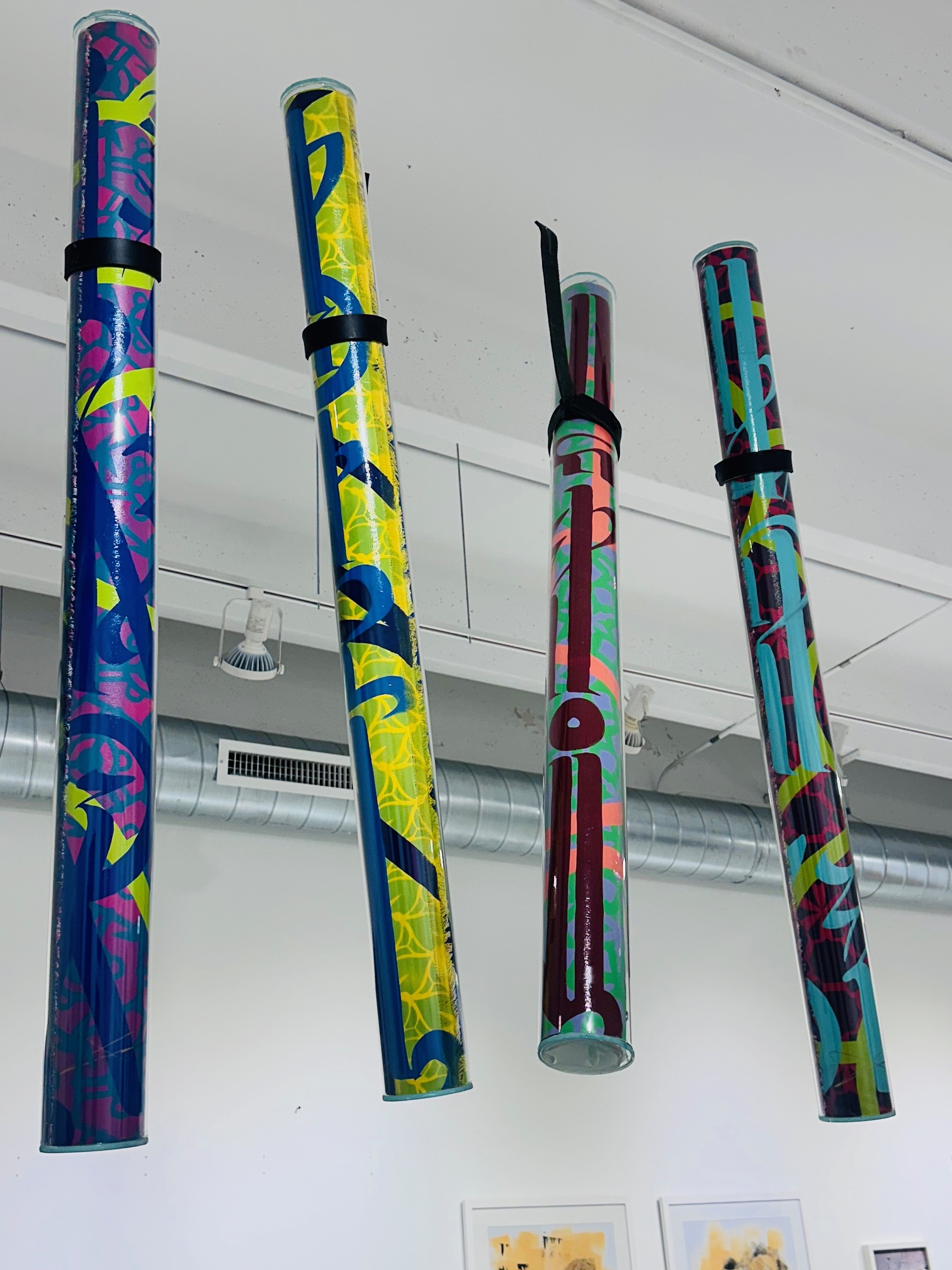 Clark Medley’s Unspeakable (FIRST PRIZE AWARD), presents six vibrant translucent cylinders suspended in the air as a moving performative installation, recalling totemic forms of industrial allure. Inside them, there are rolled canvases displaying graffiti-like inscriptions with colorful typographies revealing imaginary alphabets. Defying legibility and deferral of “written thoughts” from the “unspeakable “secrets of the artist, the works cast out fragments of encoded signs that interplay as concealment and revelation. They emanate from the artist’s introspection of his daily life personal thoughts. Black straps holding them aloft emphasize a tension between levitation and gravity in an ever-changing perpetual movement.