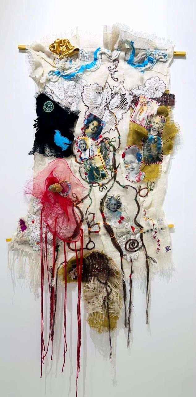 Eumelia Castro’s Genealogy (HONORABLE MENTION) is a textile workthat emerges as a tactile visual palimpsest, interweaving familial imagery, domestic materials, and symbolic narratives. Through her use of frayed gauze, lace, and linen—materials evoking ephemerality and vulnerability—Castro situates personal memory within a framework of aesthetic collection; a personal mythology of transferred photographic portraits, delicately overlaid with embroidery, beading, and appliqué, recovering erased lineages, where the past unfolds in rhizomatic patterns (Deleuze and Guattari). The work is as a system of affective and micropolitical connections in the construction of identity, through the laborious craft understood as a critical practice.